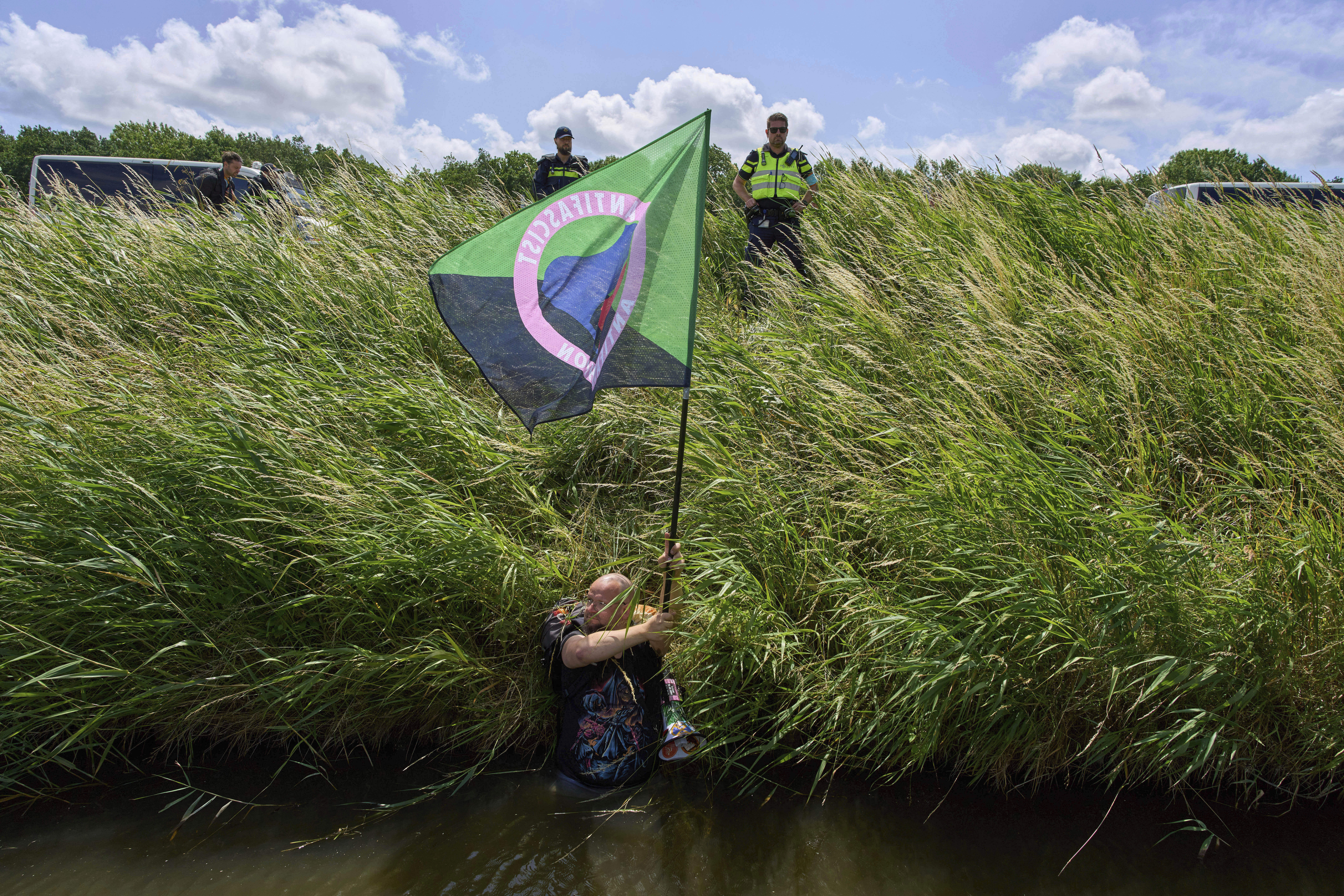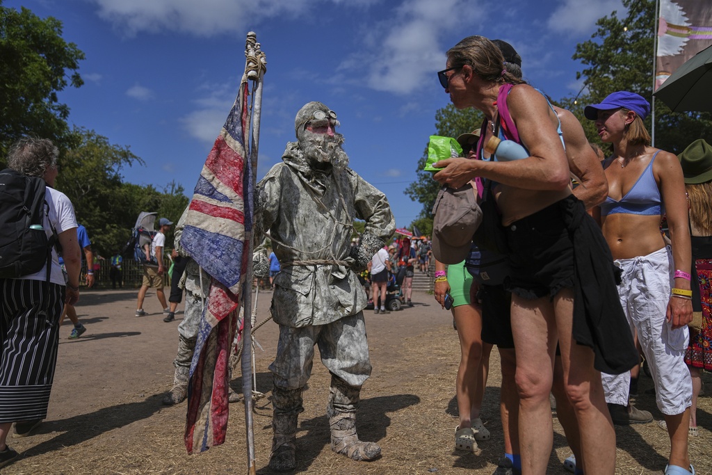 A festivalgoer dressed as an explorer makes his way through the Glastonbury Festival in Worthy Farm, Somerset, England, Thursday, June 26, 2025. (Scott A Garfitt/Invision/AP)