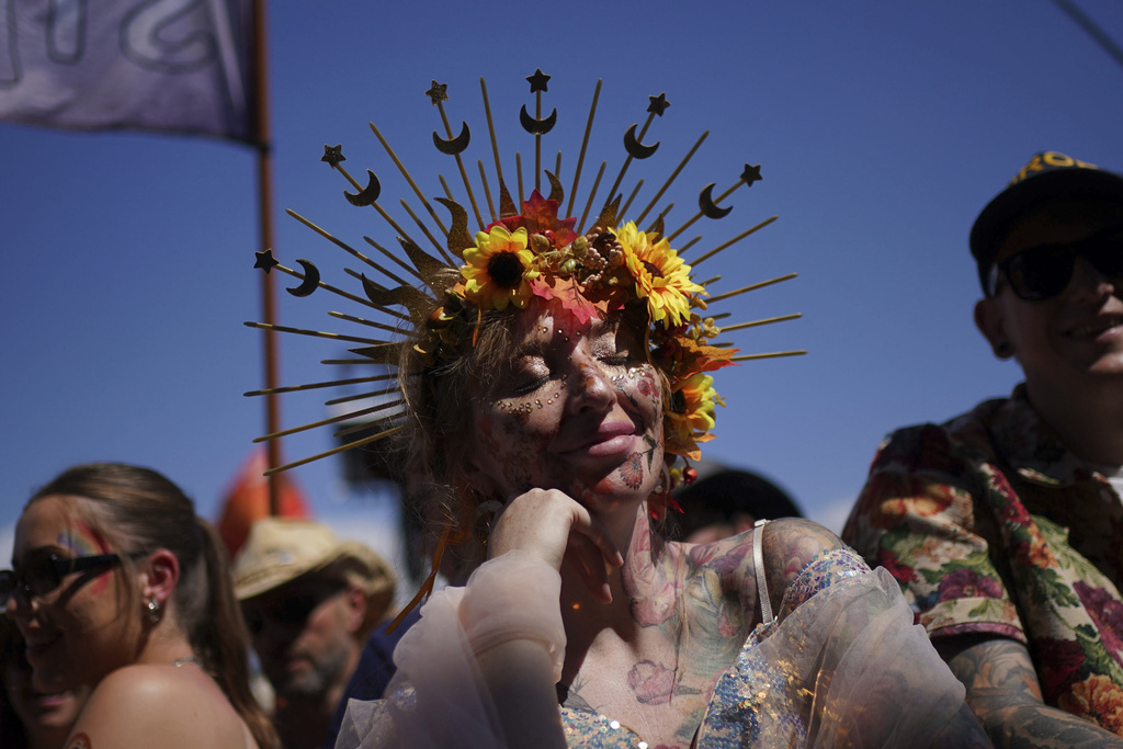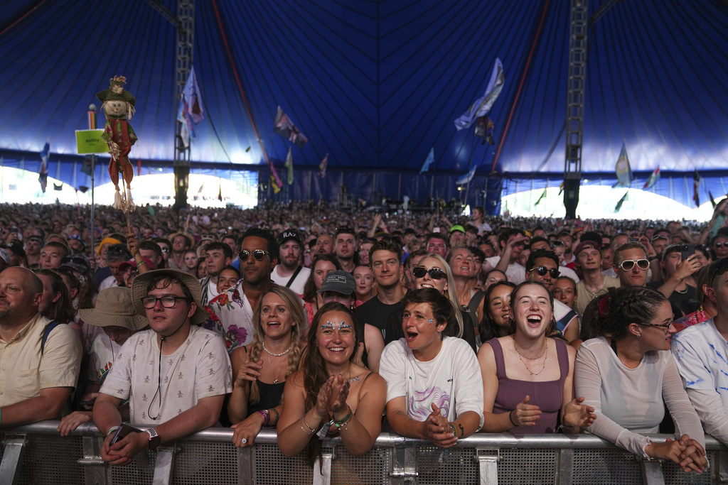 Festivalgoers during the Glastonbury Festival in Worthy Farm, Somerset, England, Friday, June 27, 2025. (Scott A Garfitt/Invision/AP)