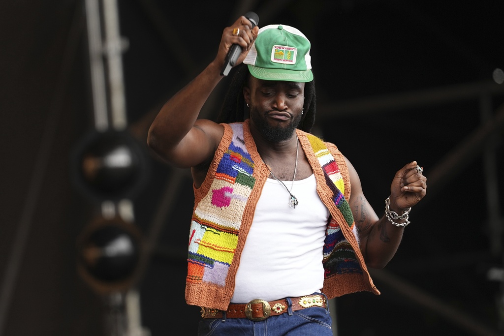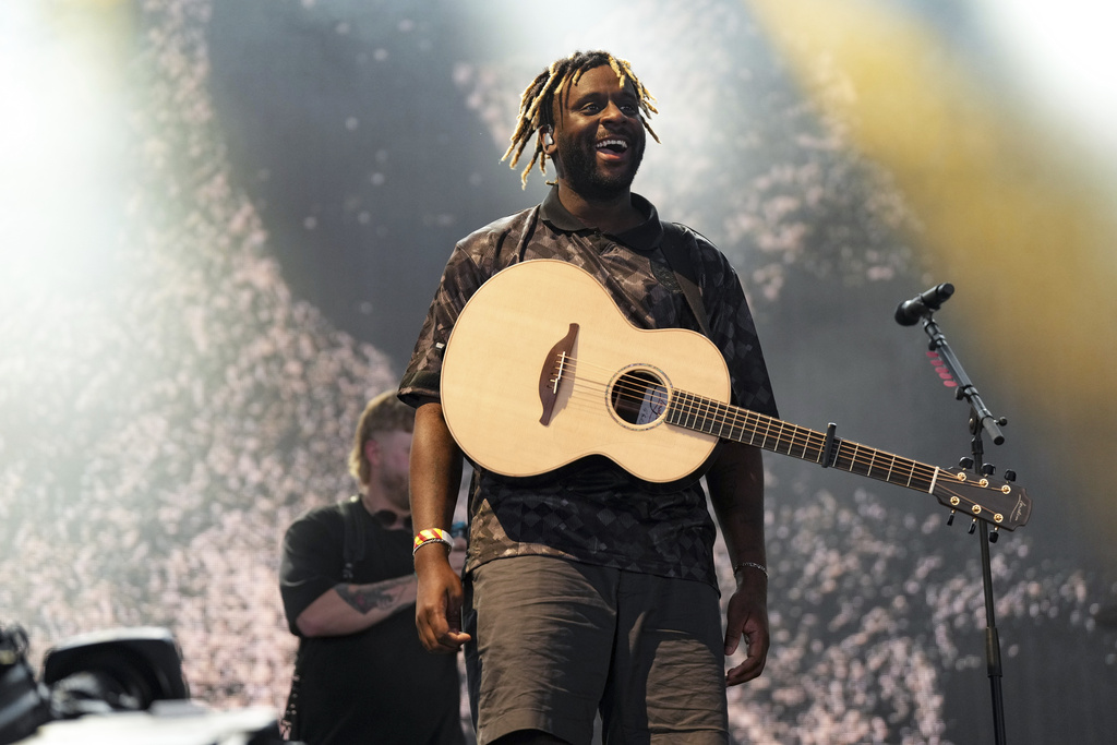 Myles Smith performs during the Glastonbury Festival in Worthy Farm, Somerset, England, Friday, June 27, 2025. (Scott A Garfitt/Invision/AP)