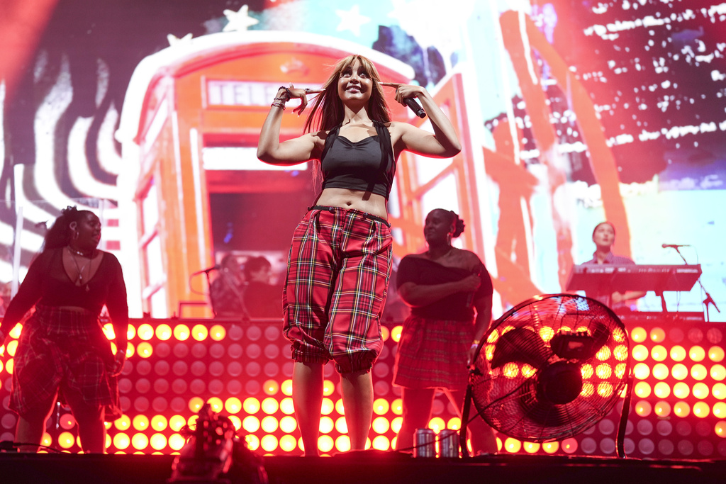 Raye performs during the Glastonbury Festival in Worthy Farm, Somerset, England, Saturday, June 28, 2025. (Scott A Garfitt/Invision/AP)