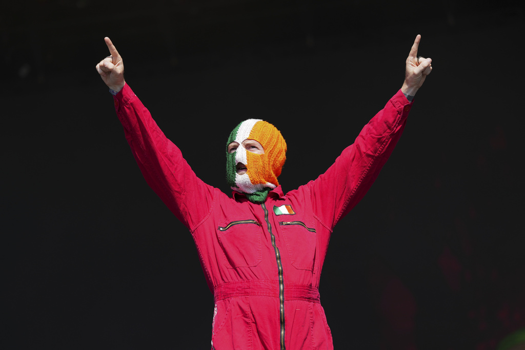 J. J. O Dochartaigh from the hip hop trio Kneecap performs during the Glastonbury Festival in Worthy Farm, Somerset, England, Saturday, June 28, 2025. (Scott A Garfitt/Invision/AP)
