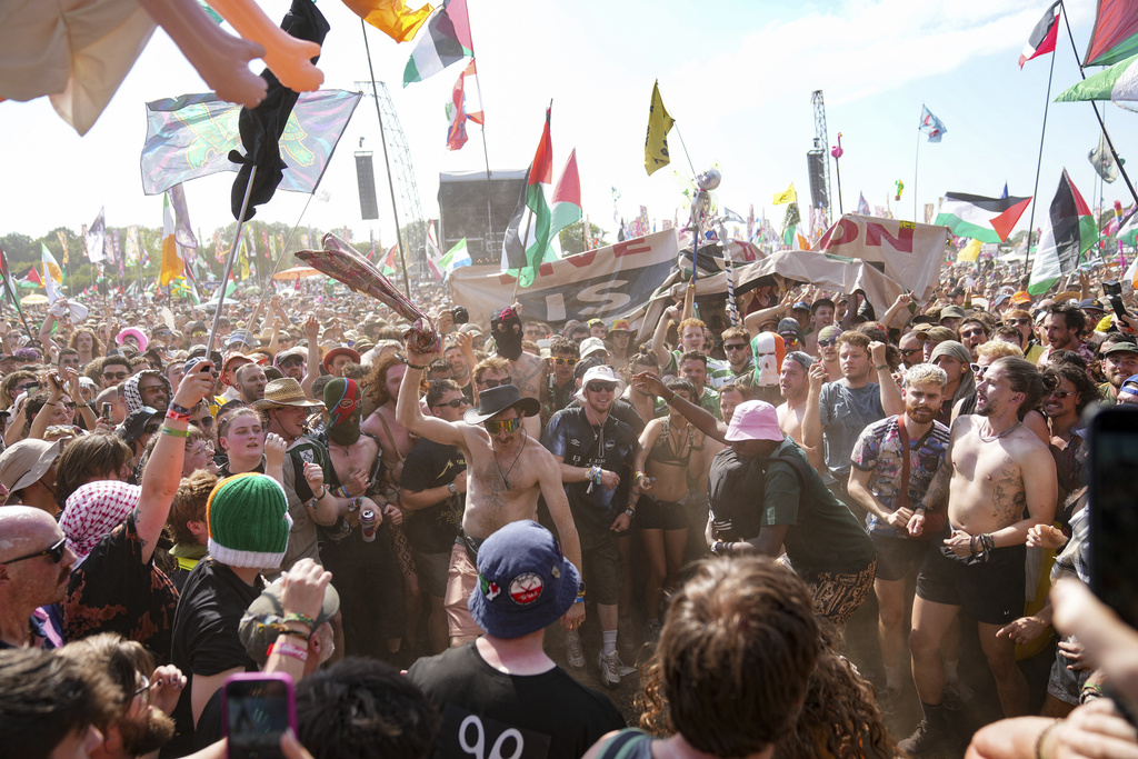 A mosh pit forms during the hip hop trio Kneecap’s performance during the Glastonbury Festival in Worthy Farm, Somerset, England, Saturday, June 28, 2025. (Scott A Garfitt/Invision/AP)