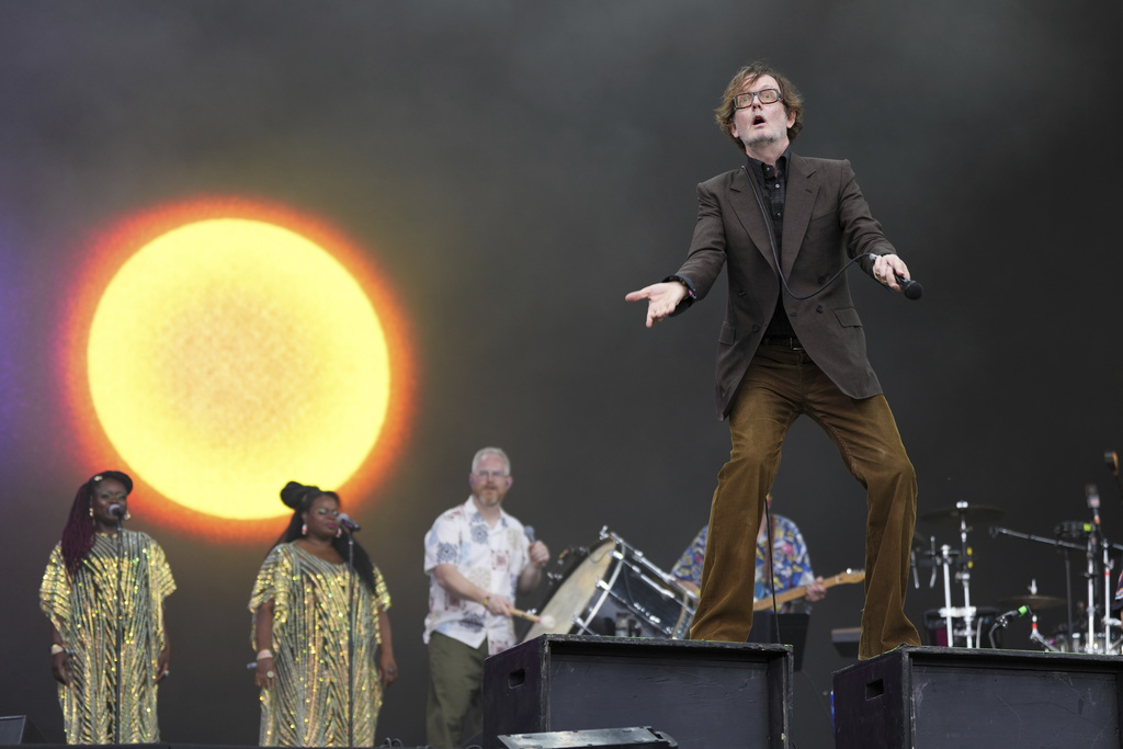 Jarvis Cocker of the rock band Pulp performs during the Glastonbury Festival in Worthy Farm, Somerset, England, Saturday, June 28, 2025. (Scott A Garfitt/Invision/AP)