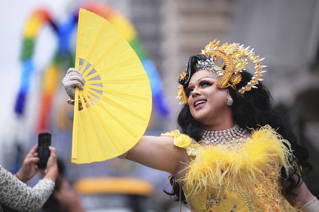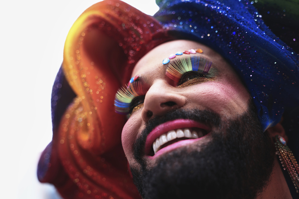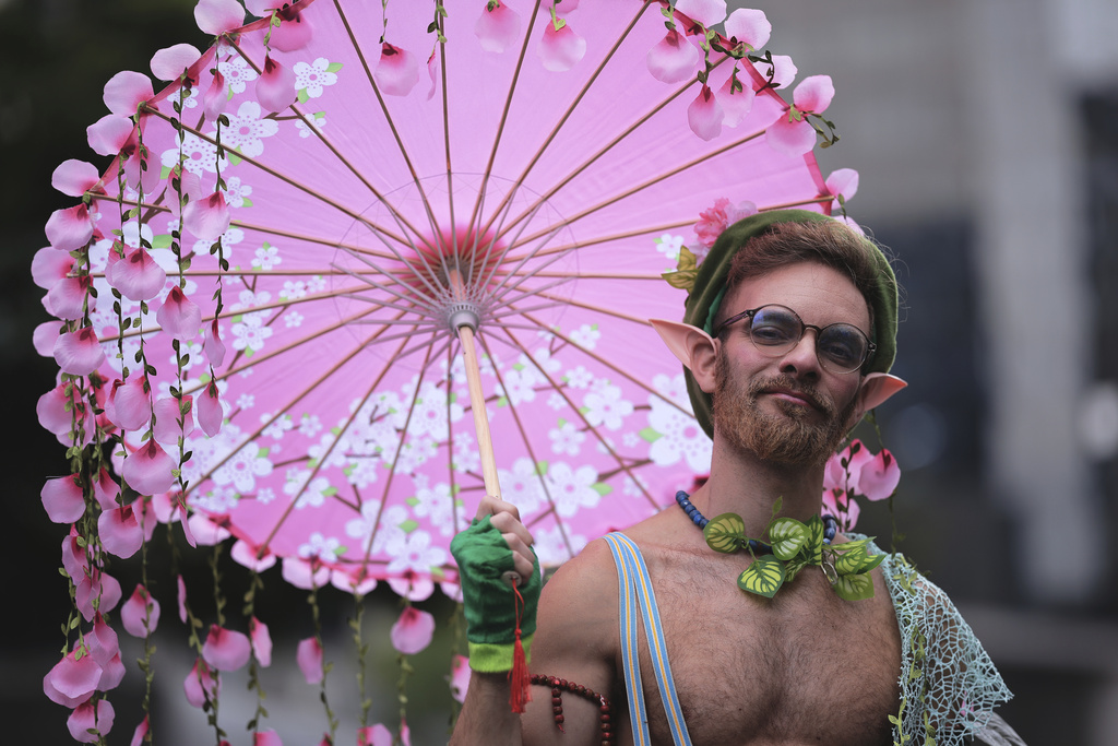 A reveler strikes a pose during the annual Pride parade marking LGBTQ+ Pride Month, in Sao Paulo, Sunday, June 22, 2025. (AP Photo/Ettore Chiereguini)