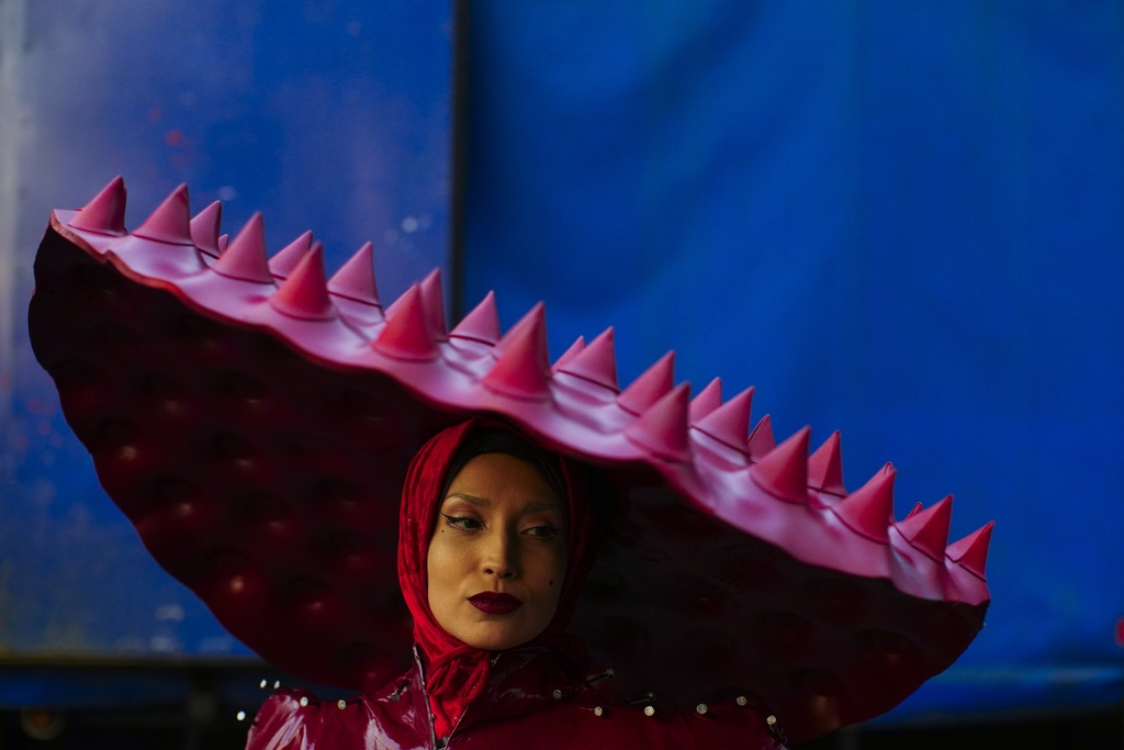 A woman dressed in a Lady Gaga iconic outfit takes part in the annual Gay Pride parade marking LGBTQ+ Pride Month, in Santiago, Chile, Saturday, June 21, 2025. (AP Photo/Esteban Felix)