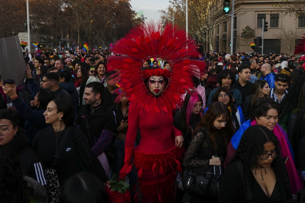 People take part in the annual Gay Pride parade marking LGBTQ+ Pride month, in Santiago, Chile, Saturday, June 21, 2025. (AP Photo/Esteban Felix)