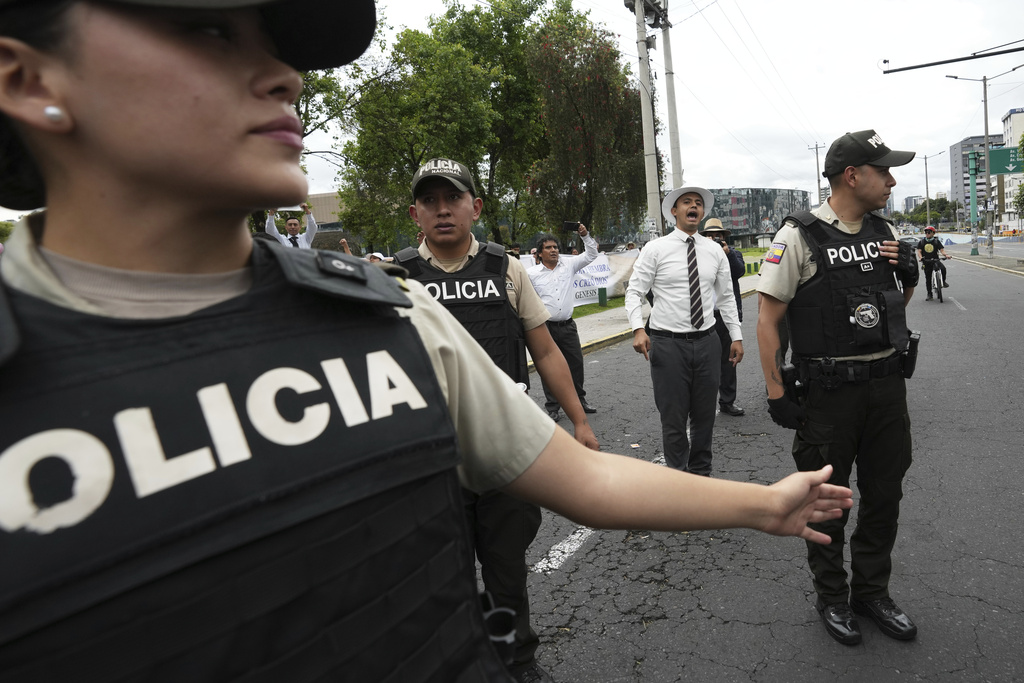 Police work to prevent a dispute between a group with anti-gay sentiments and members of the LGBTQ+ community, during a Pride parade in Quito, Ecuador, Saturday, June 21, 2025. (AP Photo/Dolores Ochoa)