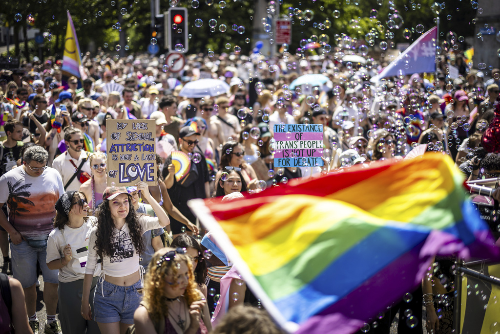 People take part in the Zurich Pride parade in Zurich, Switzerland, on Saturday, June 21, 2025. (Michael Buholzer/Keystone via AP)