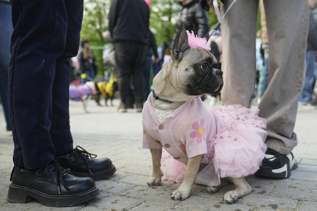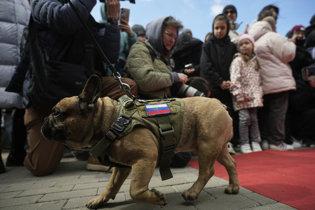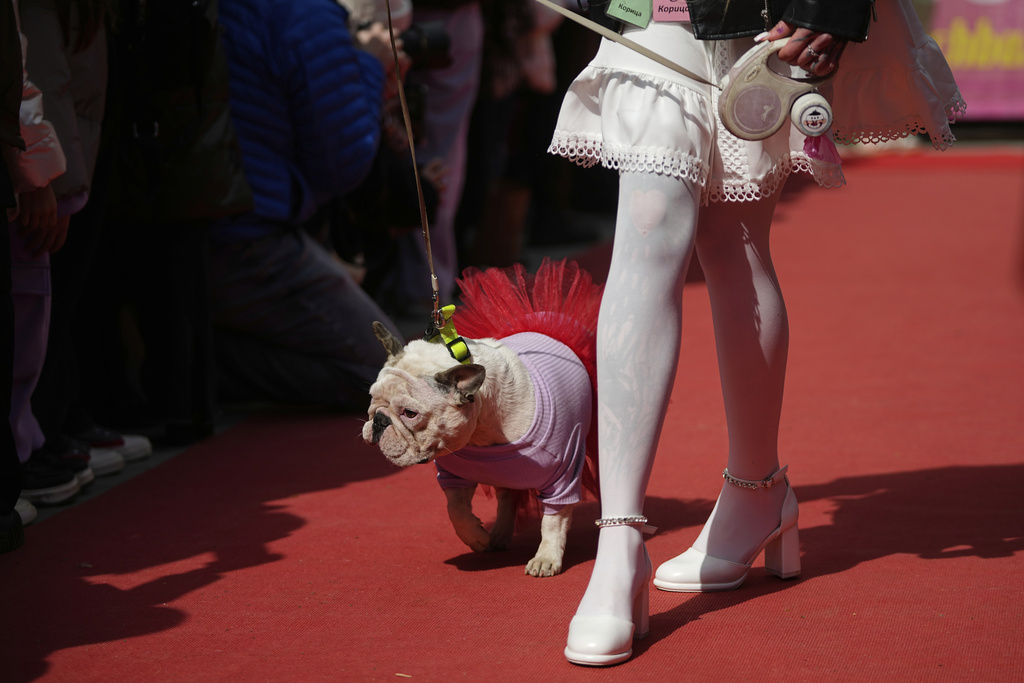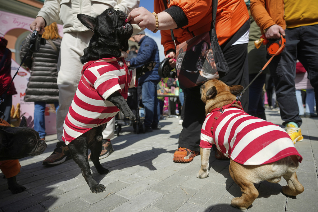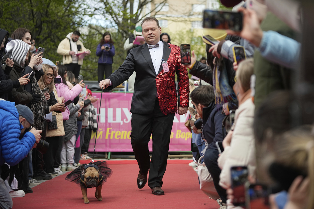 A man attends the French bulldogs parade at the Vorontsovsky park in Moscow, Russia, Sunday, April 27, 2025. (AP Photo/Pavel Bednyakov)