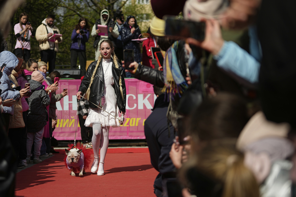 A woman attends the French bulldogs parade at the Vorontsovsky park in Moscow, Russia, Sunday, April 27, 2025. (AP Photo/Pavel Bednyakov)