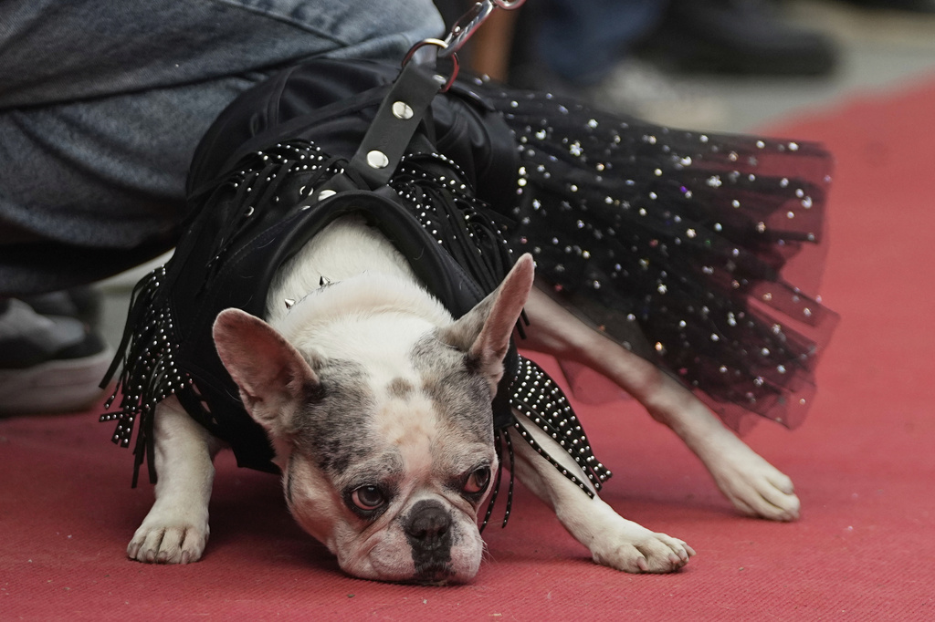 A French bulldog attends the French bulldogs parade at the Vorontsovsky park in Moscow, Russia, Sunday, April 27, 2025. (AP Photo/Pavel Bednyakov)