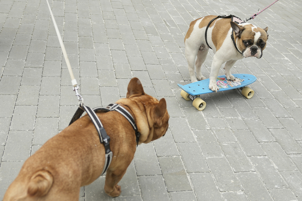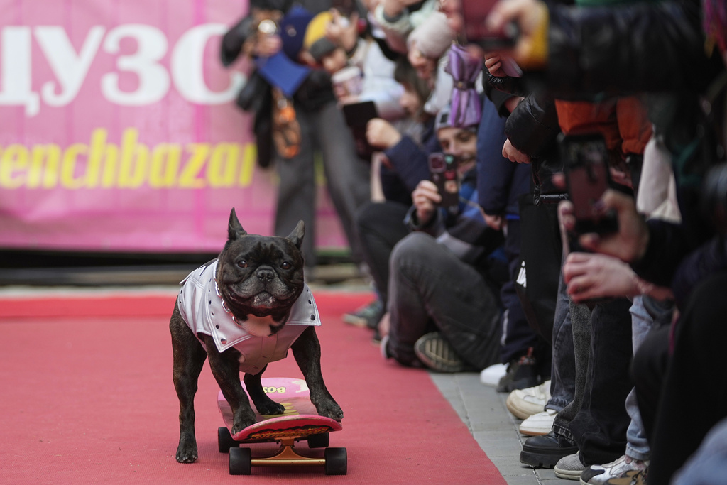 A French bulldog rides a skateboard during the French bulldogs parade at the Vorontsovsky park in Moscow, Russia, Sunday, April 27, 2025. (AP Photo/Pavel Bednyakov)
