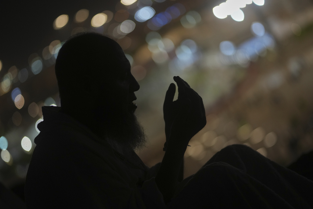 A Muslim pilgrim prays during the annual Hajj pilgrimage on the Plain of Arafat, near the holy city of Mecca, Saudi Arabia, Thursday, June 5, 2025. (AP Photo/Amr Nabil)