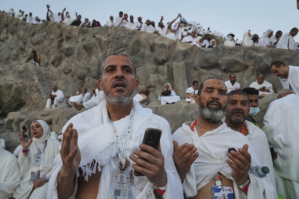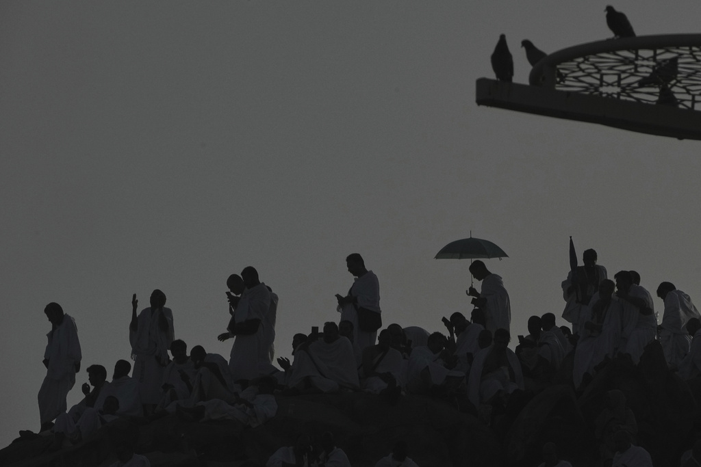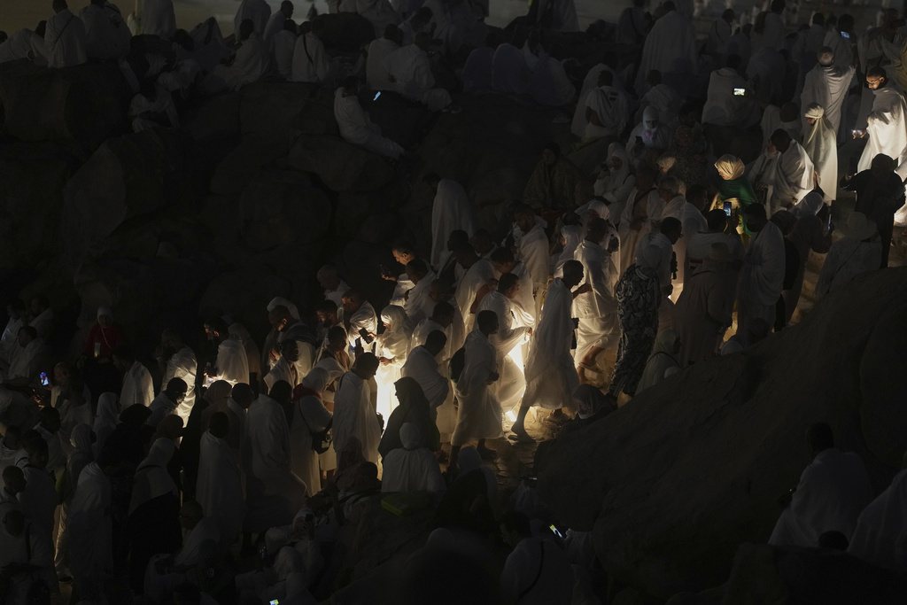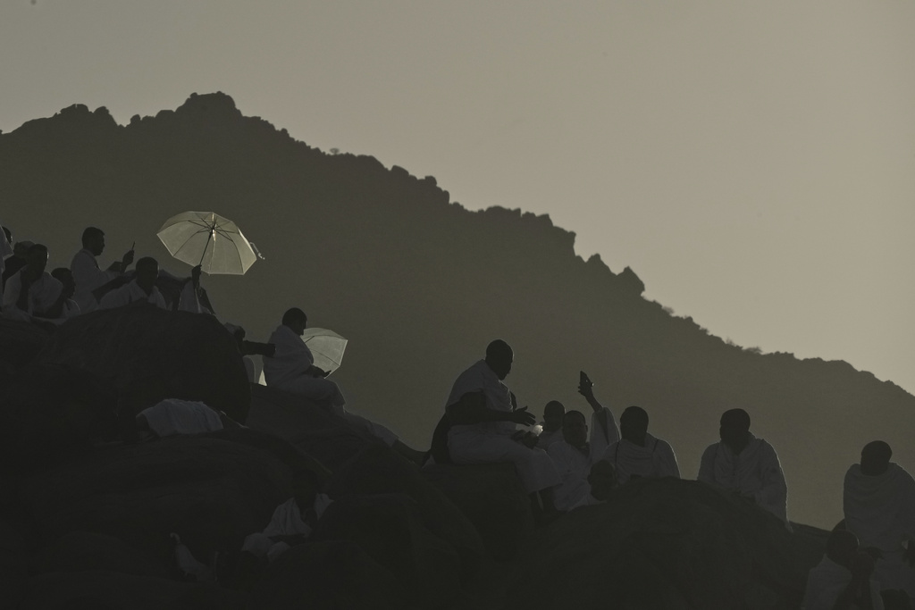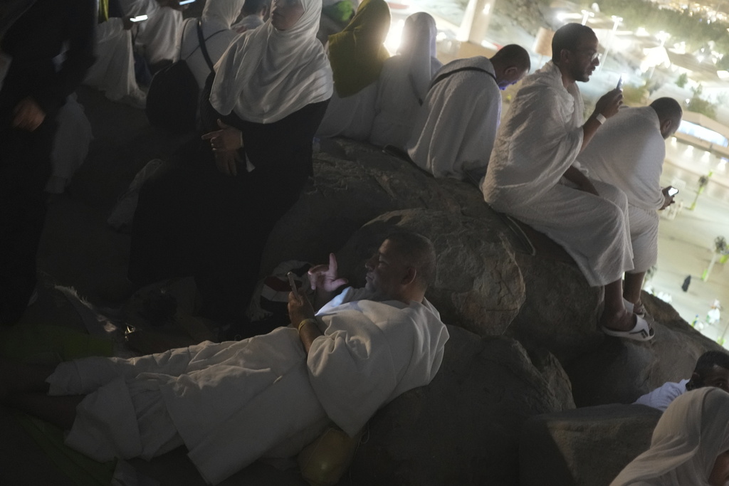Muslim pilgrims gather on top of the rocky hill known as the Mountain of Mercy, on the Plain of Arafat, during the annual Hajj pilgrimage near the holy city of Mecca, Saudi Arabia, Thursday, June 5, 2025. (AP Photo/Amr Nabil)