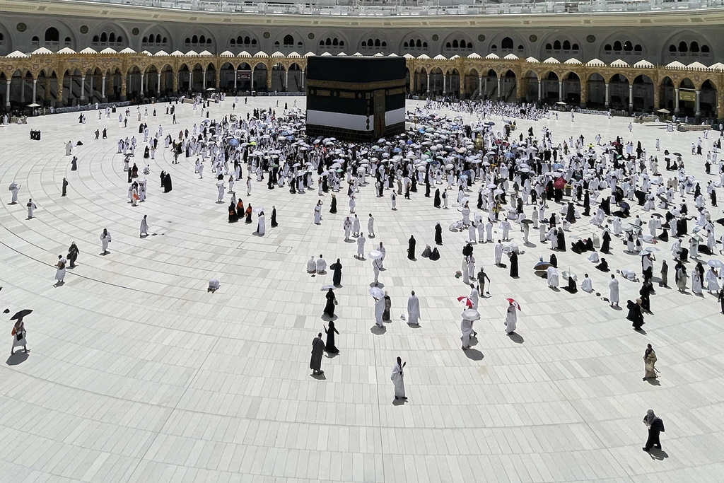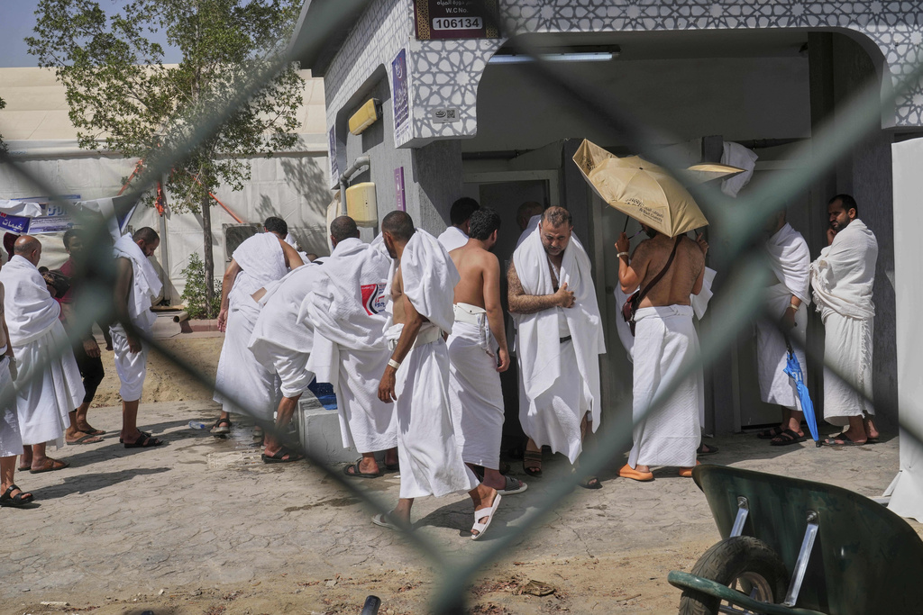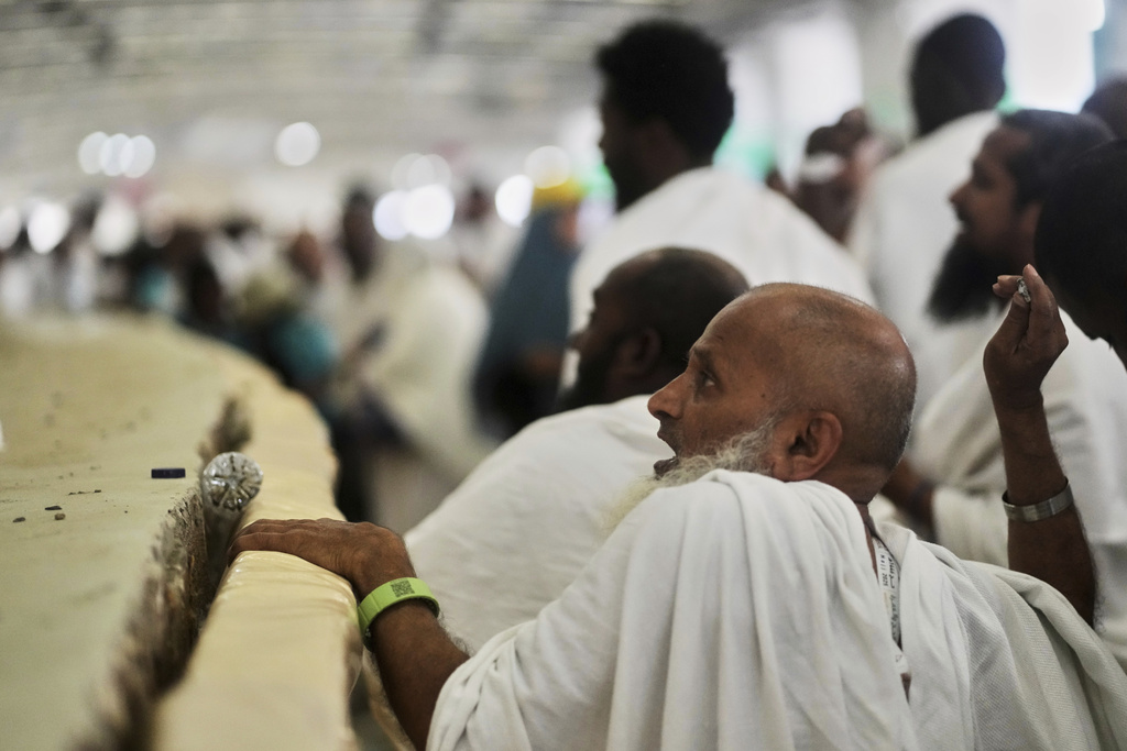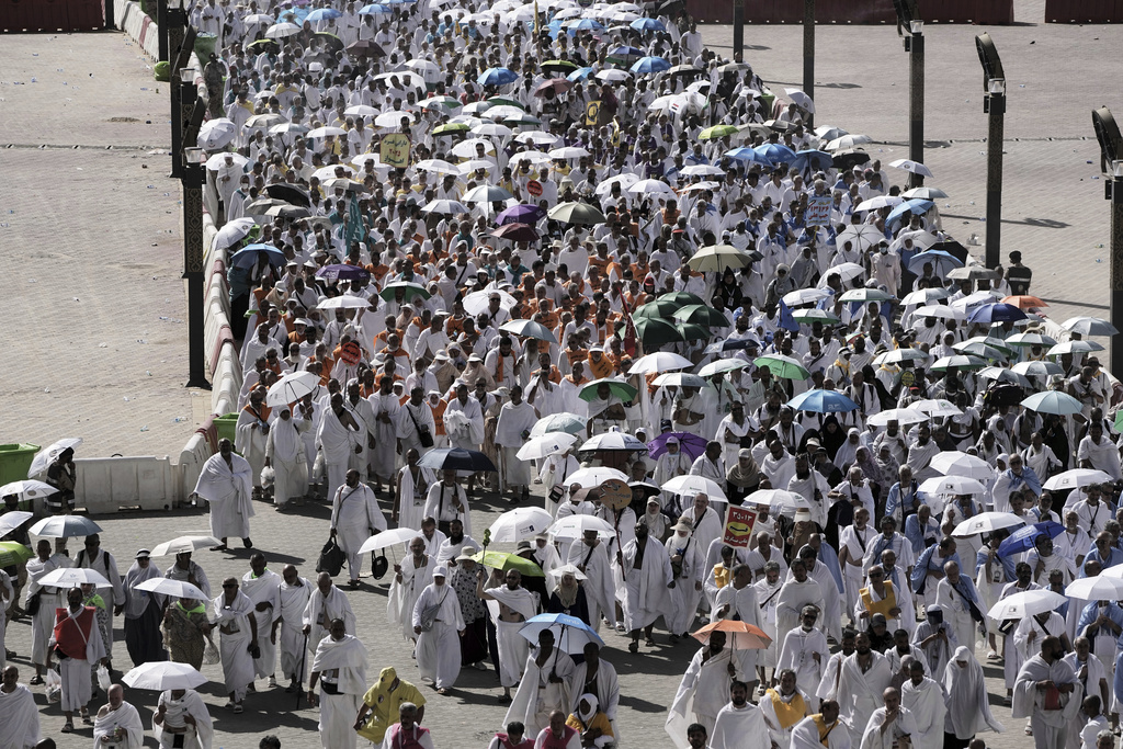 Egyptian pilgrims share an umbrella outside the Grand Mosque during the annual hajj pilgrimage at the holy city of Mecca, Saudi Arabia, Tuesday, June 3, 2025. (AP Photo/Amr Nabil)