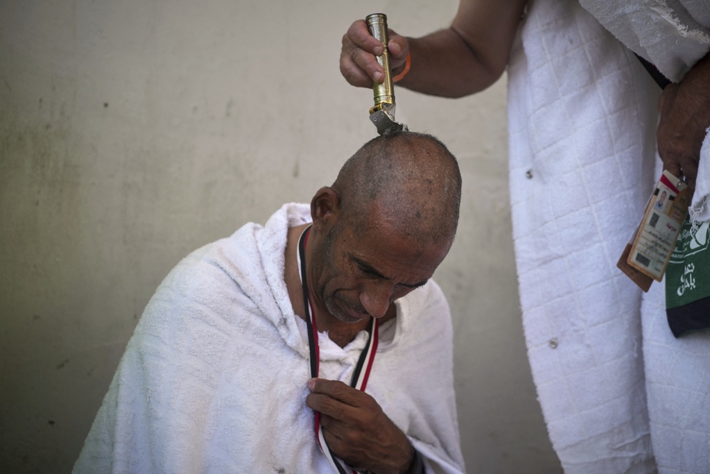 A Muslim pilgrim shaves his head, a significant part of the Umrah and Hajj rituals in Islam, during the symbolic stoning of the devil, the last rite of the annual Hajj, in Mina near the holy city of Mecca, Saudi Arabia, Friday, June 6, 2025. (AP Photo/Amr Nabil)