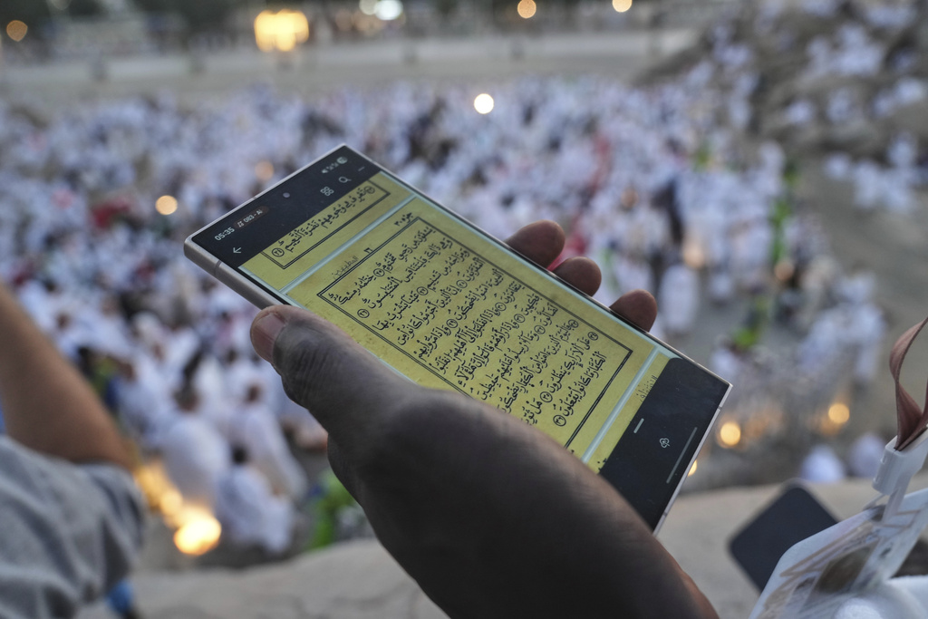 A Muslim pilgrim uses a mobile phone to read chapters from the holy Quran atop the rocky hill known as the Mountain of Mercy, on the Plain of Arafat, during the annual Hajj pilgrimage near the holy city of Mecca, Saudi Arabia, Thursday, June 5, 2025. (AP Photo/Amr Nabil)