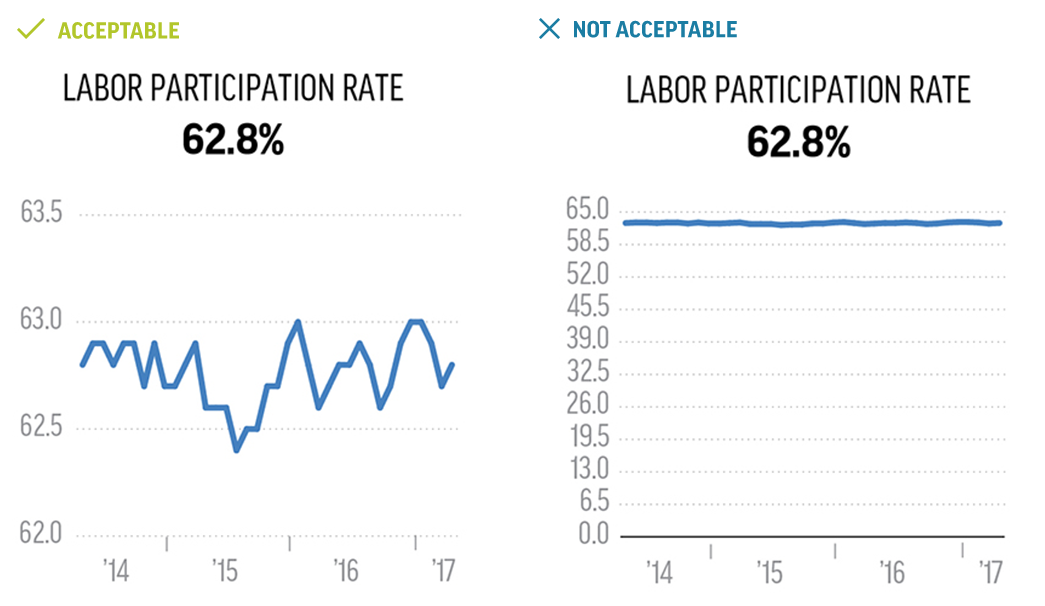 Line charts are great for tracking trends. In this case, the value axis does not have to start at zero. However there are some rules. Your chart should be balanced within the middle of the chart and don’t omit time periods. Keep the time intervals even.